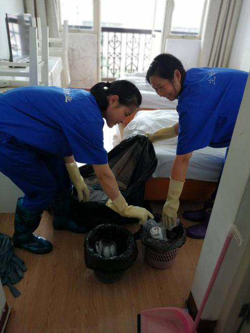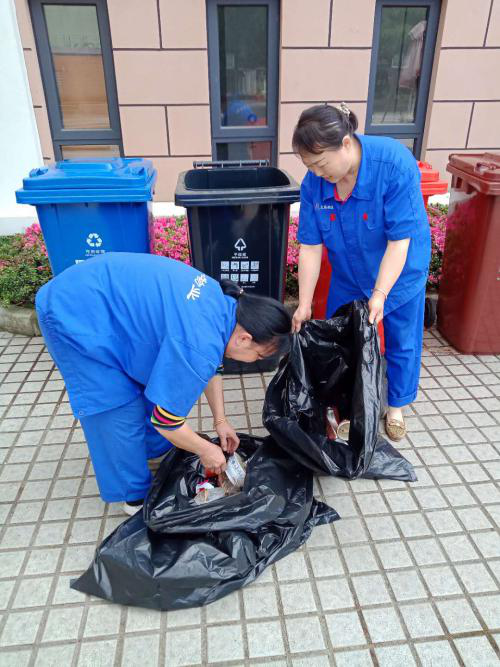 开展拉圾分类、努力打造绿色环保校园,对此我物业深感责任重大,持续加强环境卫生的精细化管理,提高保洁水平。在中山北一路校区的各个角落、各个楼宇,保洁员们会对学生们投放到垃圾箱的垃圾进行再分类,每个垃圾袋均会重新打开,将各类垃圾分拣出来,重新投放至正确的分类垃圾桶内。