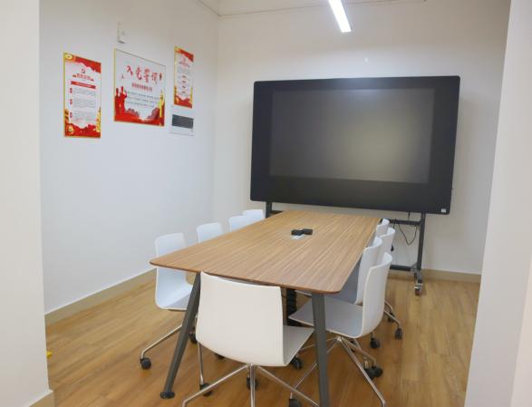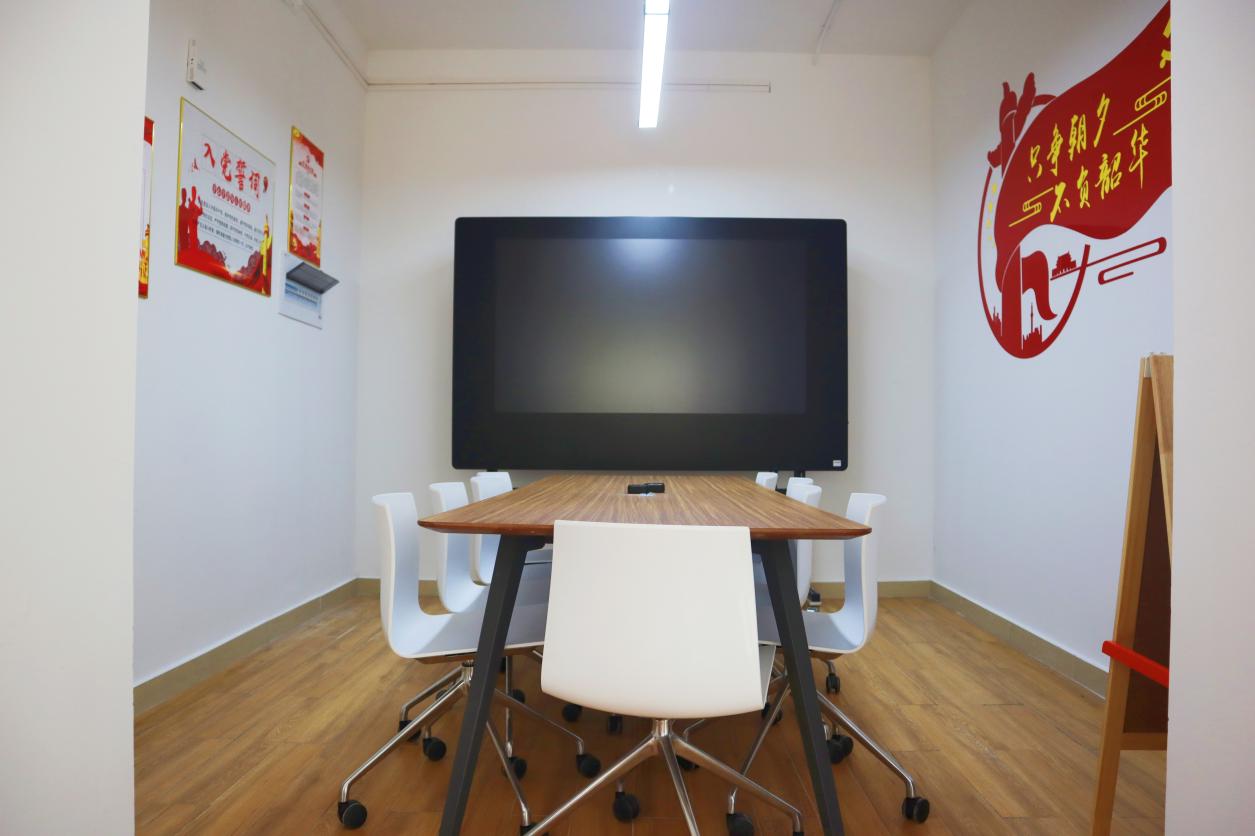党建区配置了可触点智慧屏、可接电会议桌及可移动滑轮椅。该区域使用采用团体预约制,预约表格可至楼长处领取噢。