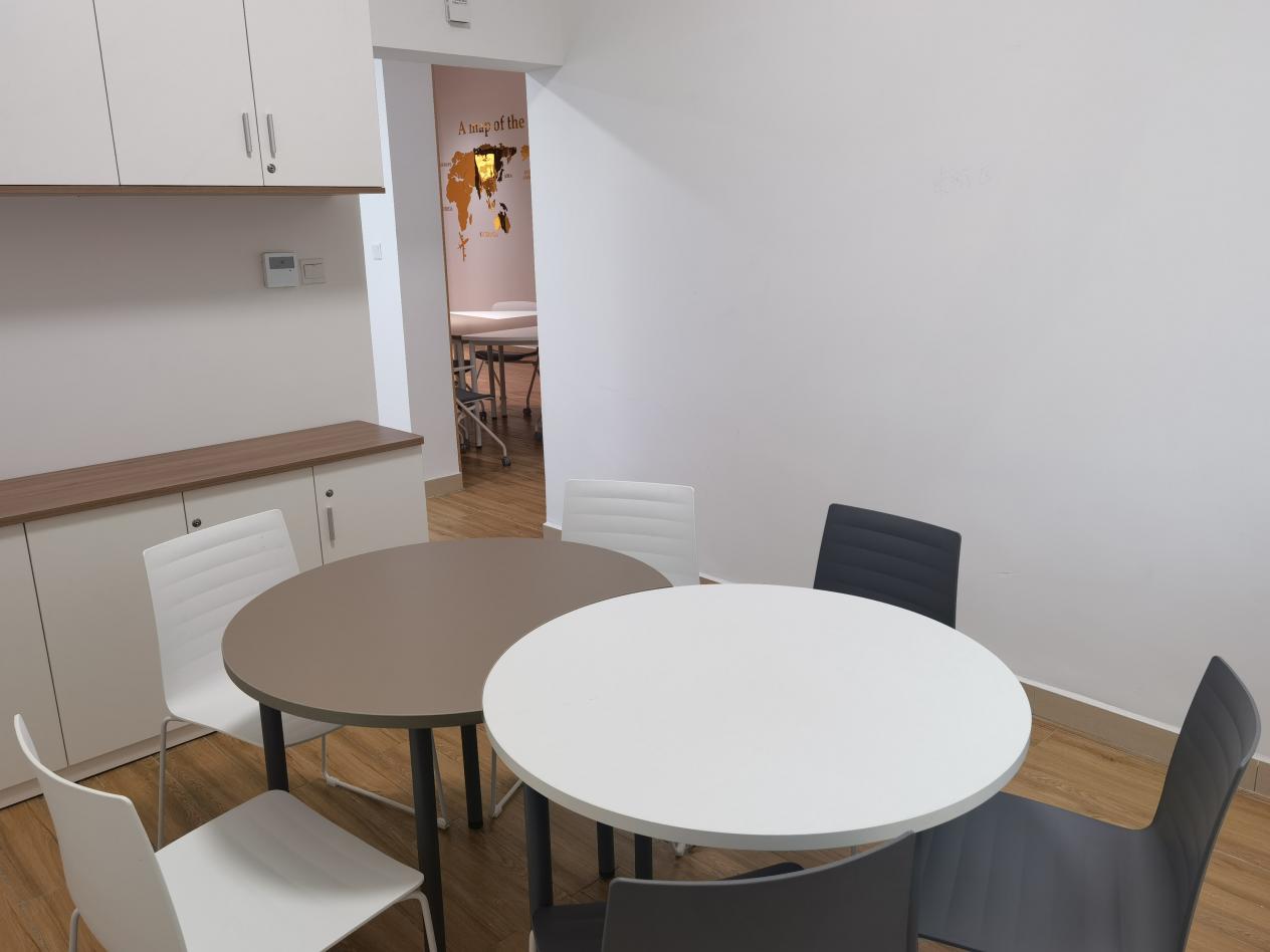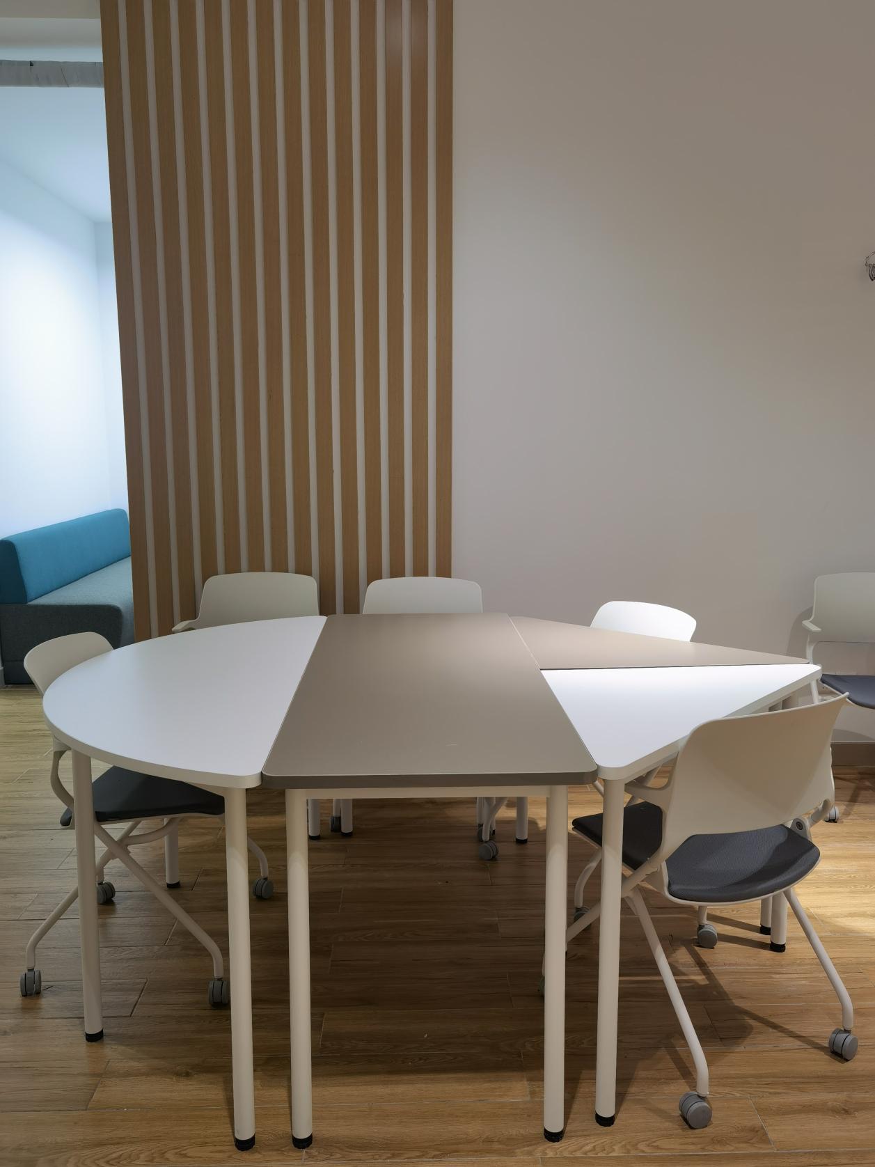会议区配置了三角桌、半圆桌、长条桌三种可移动桌型,可以任意拼接、随意搭配,为各种形式的会议提供多种可能。
