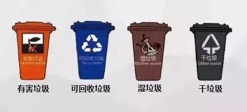 目前,上海生活垃圾分类是四分类,有害垃圾使用红色垃圾桶、可回收物使用蓝色垃圾桶、湿垃圾使用棕色垃圾桶、干垃圾使用黑色垃圾桶。