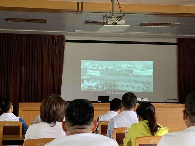 党员们在八连教导员的带领下,一同观看纪录片《上海黎明》,影片以“南京路上好八连”官兵为原型,感动了一代又一代人。