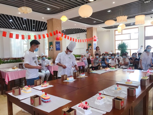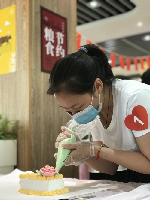 蛋糕制作环节中,女员工们发挥各自的想象力和创造力,用奶油、水果等食材,精心设计装点着具有爱国情怀和元素的蛋糕,表达对祖国母亲的美好祝福。