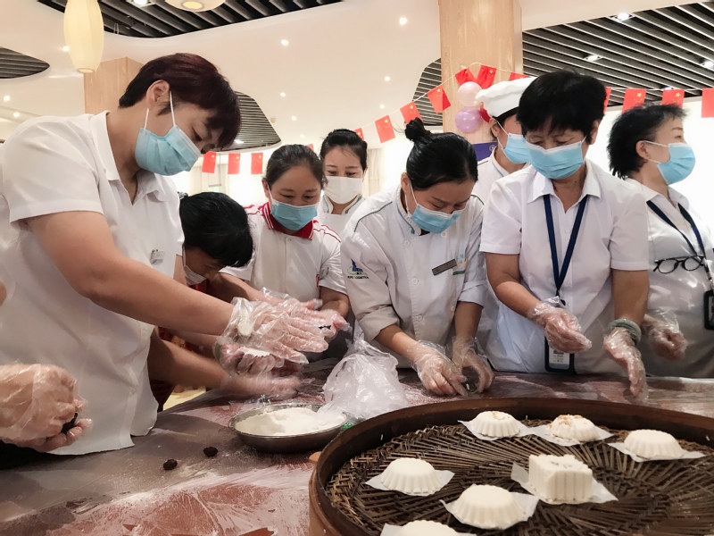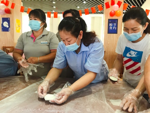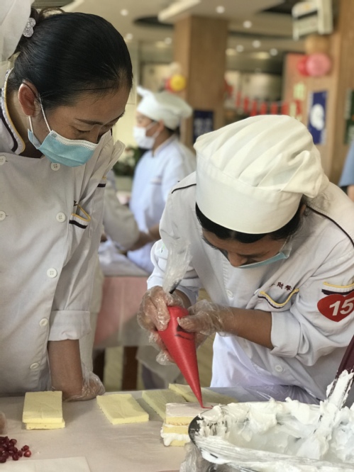 活动现场气氛轻松愉悦。来自后勤中心各岗位的女员工们变身为虚心求教的学生,跟着点心师傅认真学习桂花糕和蛋糕的制作,大家互相协作共同“作战”,准备制作美味可口的甜食。