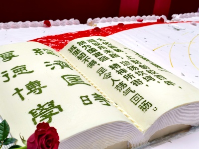 这份由食堂点心师傅们连夜匠心制作的蛋糕,长6米,宽2米,以其磅礴气势象征着上财108年来的深厚积淀与辉煌成就。蛋糕设计别具匠心:顶部不仅绘有精美的校徽、校训及标志性校门图案,还有庆祝上海财经大学建校108周年的醒目logo。尤为引人注目的是,一本立体的《上财赋》跃然其上,其中“大化驰轮,上财创校百年,凝视所来路,激扬坎坷,然为国富强,精神所寄,其坚韧不懈,足令人荡气回肠”的词句,无声地诉说着学校的百年风华与精神传承,引得师生纷纷驻足拍照,记录这一难忘瞬间。
