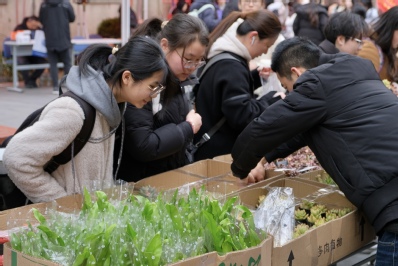 为了美化学生日常的寝室居住环境,除了这些志愿服务项目外,同学们还可以现场免费领用学生社区部准备的软装饰品。此外,步行街上还有低价的多肉、绿植售卖。第一食堂前摆放的各式各色小型盆栽,吸引了众多师生驻足观赏与选购。